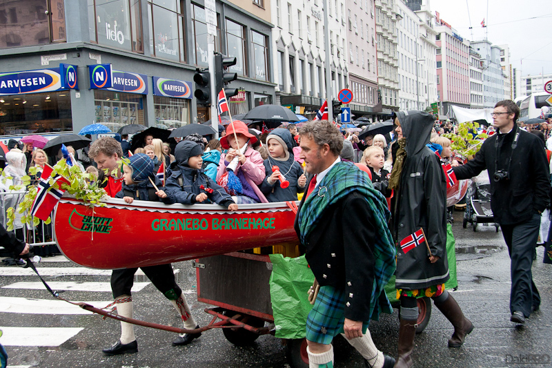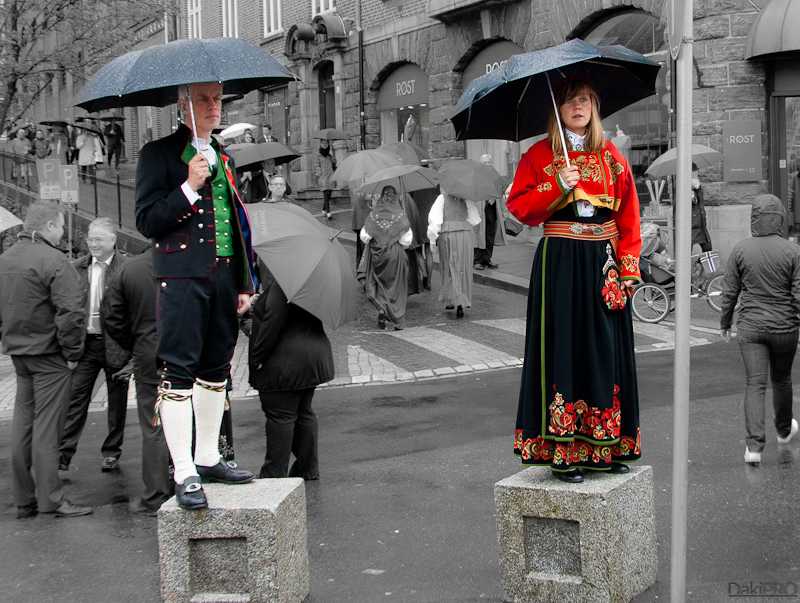 Često se čovek u tudjini oseca strancom, da ne kažem skoro svaki dan. Al se ne sećam da sam se ikada igde osećao strancom više nego ovaj dan ovde. Tešim se kako se polako integrišem u društvo, recimo u dragstoru klimam glavom kao pravi norvežanin a eto pre neki dan sam zadremao u busu kao pravi „local“, i znam da ću naučiti jezik i naučiću pravila društva, i norveške zakone, i da spavam danju leti i da se budim noću kada jutro zimi sviće u 12 popodne, i naučiću da kada se osećam umorno istrčim uz i niz obližnju planinu da bi se odmorio (norveški recept, i kunu se i naši i njini da funckioniše fanstastično) ali mislim da nikada neću biti blizu te radosti i tog ponosa koje norvežani imaju na ovaj dan. U nekim zemljama je recimo sramota da se nosi tradicionalna odeća tog naroda i narodnosti, već se na skupovima i dešavanjima uglavnom nosi neka kopija italijanske odeće i obuće i maše se torbicama okačenim na ukočenim laktovima, a ovde je danas najveća sramota bila izaći u kostim Bear Grilsa, što kaže moj kolega, u kabanici i kišnim pantalonama umesto u narodnoj nošnji. Da sam ikada nosio srpsku narodnu nošnju, i da sam je kojim slučajem imao danas, mislim da bih bio najponosniji norvežanin medju svim srbima. Ovako sam mogao samo, kao i ostali turisti, da se držim za banderu i slikam naokolo, i da se krišom radujem (kako to nijedan norvežanin neće nikada razumeti) kada provalim da još neko ne zna norveški, jer se tešim da nisam najgori Grils u gradu.